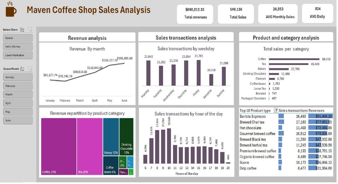 This project analyzes transaction data for Maven Roaster, a fictional coffee shop with three NYC locations. The dataset, sourced from Maven Analytics, spans the first half of 2023 and includes transaction timestamps, locations, and product-level details.Tools & Techniques