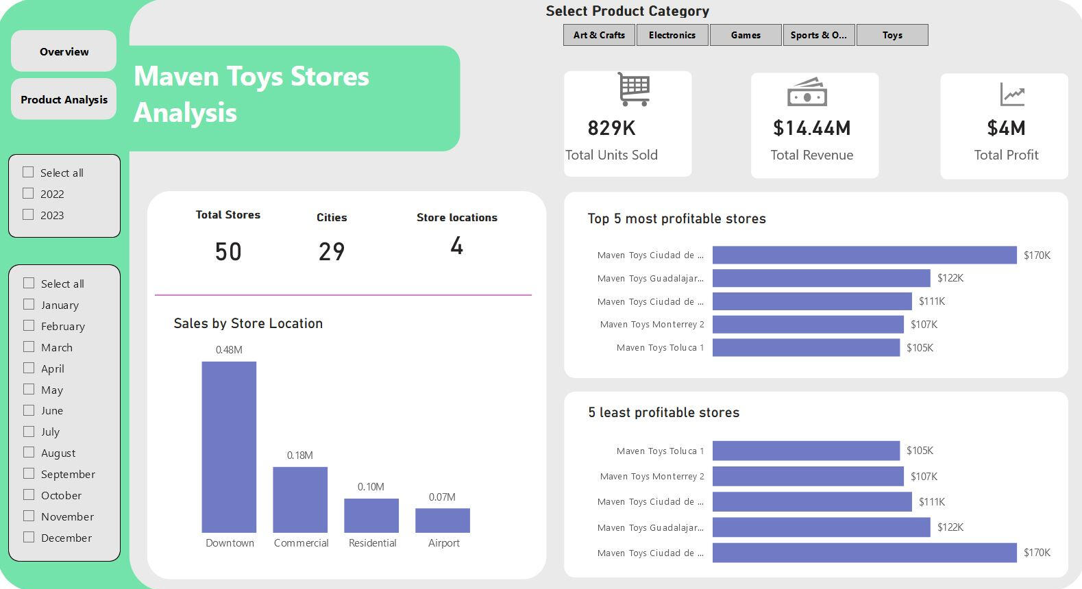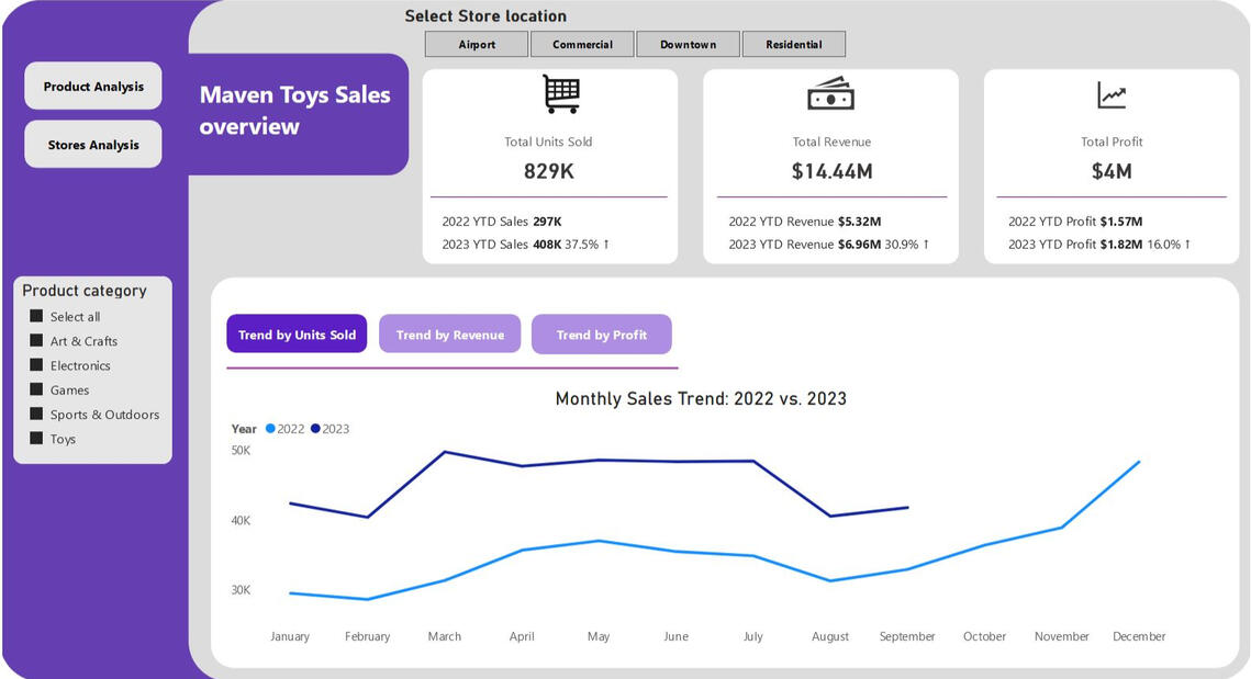 This project analyzes sales data from Maven Toys, a fictional toy store chain in Mexico, with data covering product sales, store performance, and inventory levels across multiple locations. The analysis highlights sales trends, profitability, and store performance over 2022 and 2023.Business Questions1. Monthly Sales Trends (2022 vs. 2023):