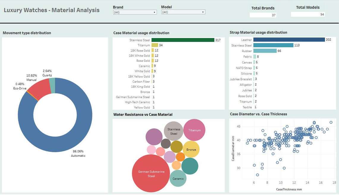 This project uses Tableau to analyze the materials commonly utilized in the luxury watchmaking industry. The dataset, imported from Kaggle, includes information on 416 watch models from 37 different brands. Key data points such as case materials, strap materials, movement types, and water resistance have been analyzed. This analysis is valuable for departments such as Product Development, Marketing, and Purchase Centers in luxury watch manufacturers, providing insights into material trends and aiding in inventory planning and sourcing decisions.Business questions