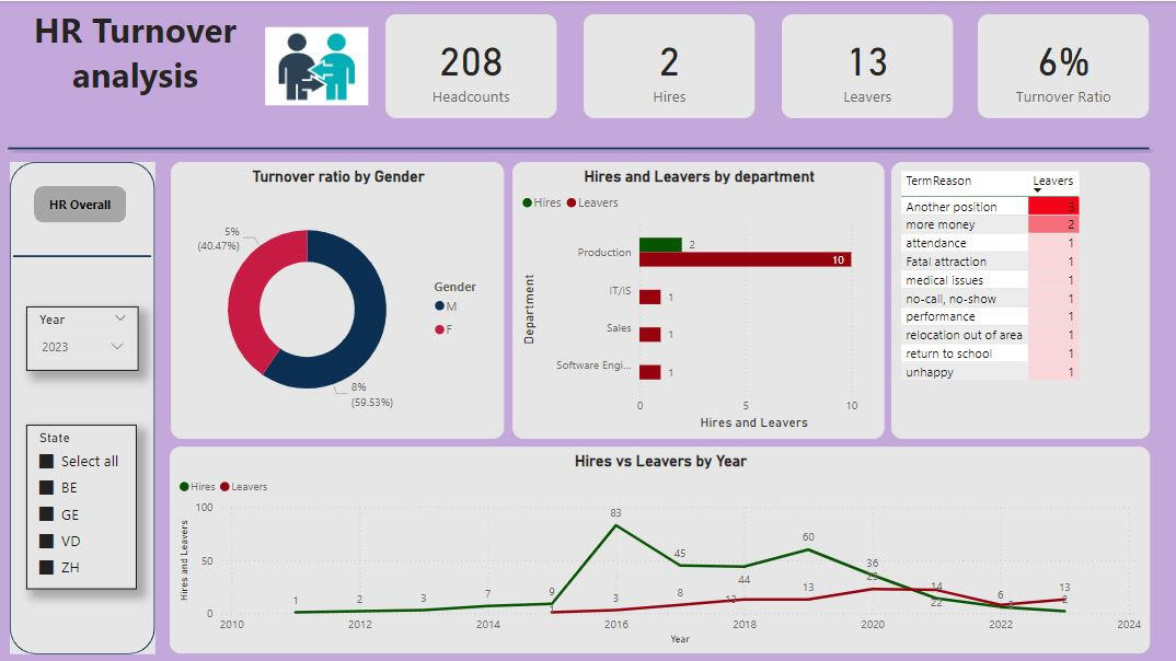 • Turnover Rate: 6% in 2023, with 13 employees leaving and only 2 new hires.