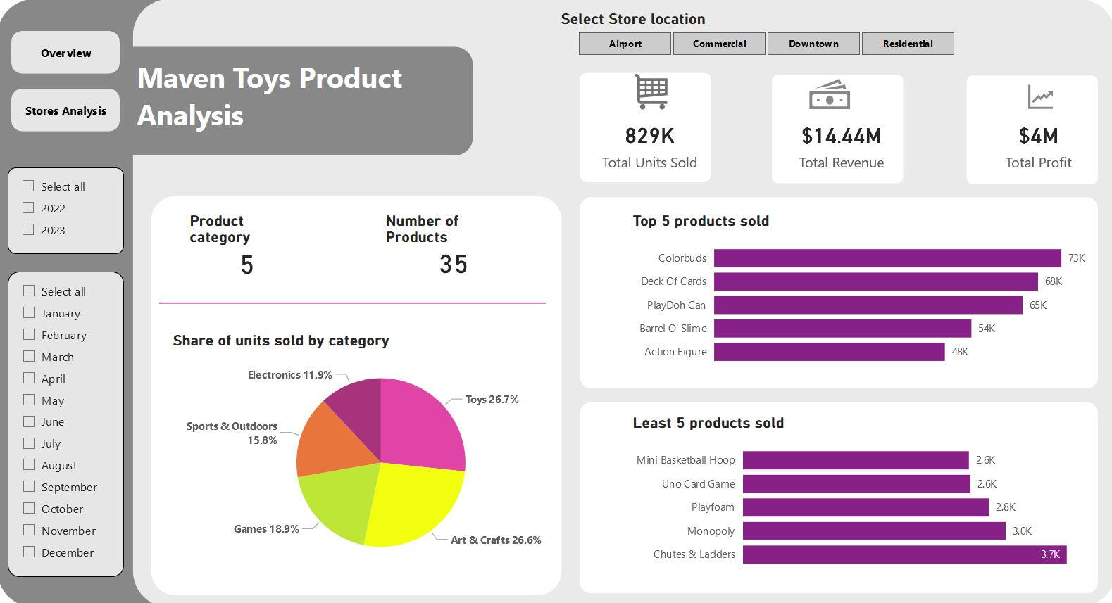 • Total Profit Margin (2022-2023): $4MSales Trends (2022 vs. 2023):While sales and profitability have grown significantly in 2023, the sales trend remains relatively consistent between the two years. The first peak of sales came earlier in 2023 (March) compared to 2022 (May). The strongest sales month in 2023 is expected to be December, driven by holiday shopping.2. Product AnalysisMaven Toys offers 35 products across five categories: